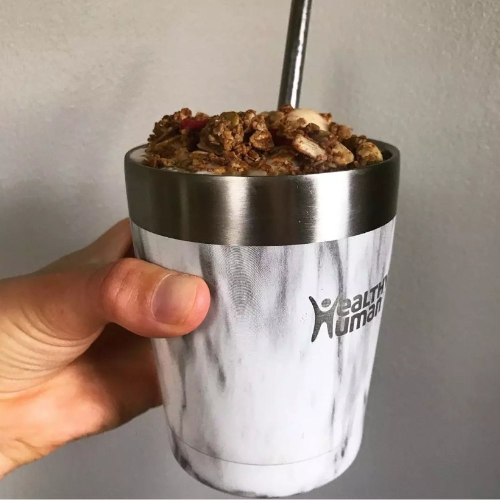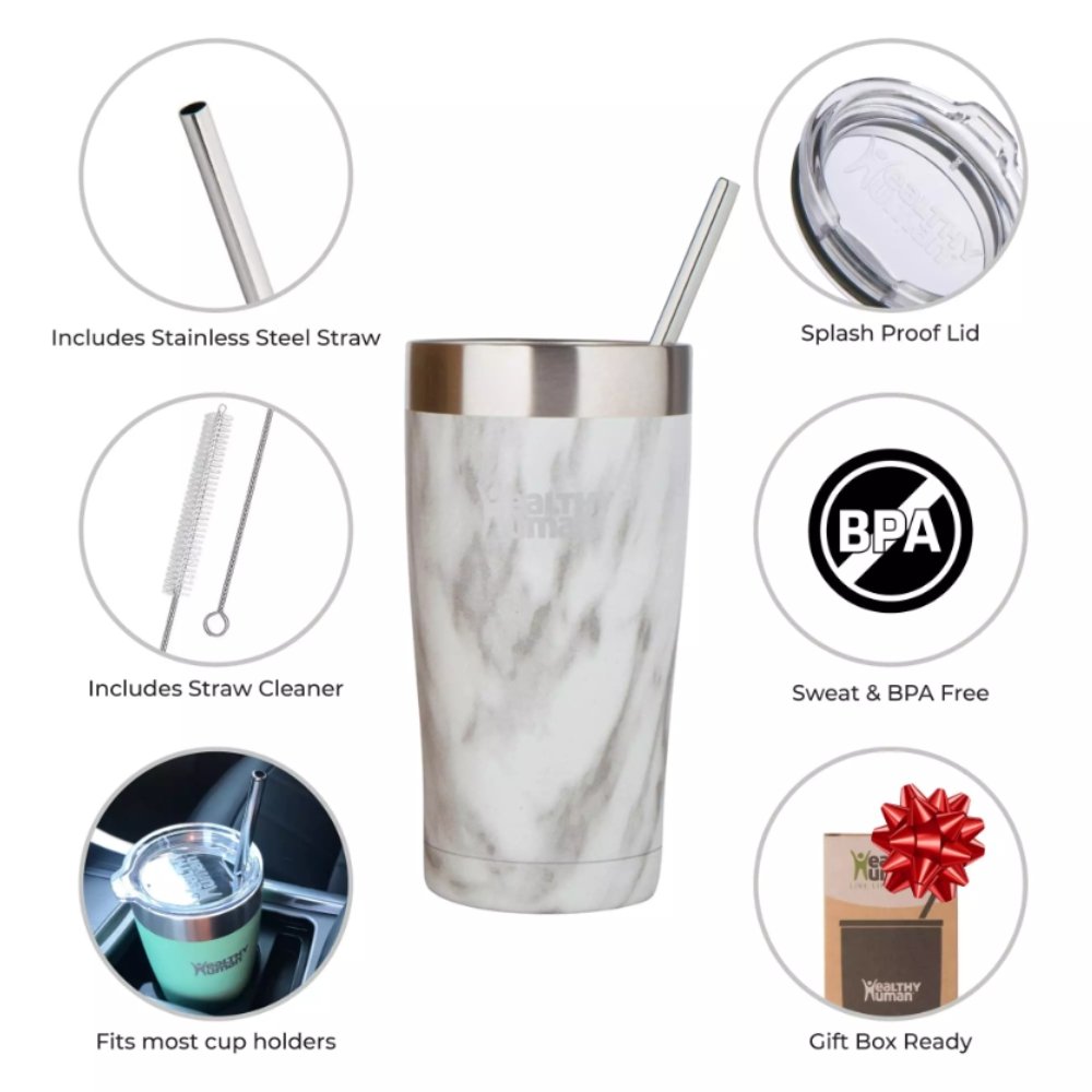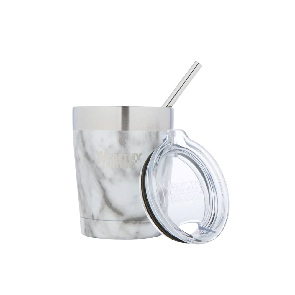 The Healthy Human Cruiser Drinking Cup 12 oz – Stone White keeps drinks hot or cold 2x longer thanks to high-quality vacuum insulation. Includes stainless steel straw, cleaner and BPA-free lid.