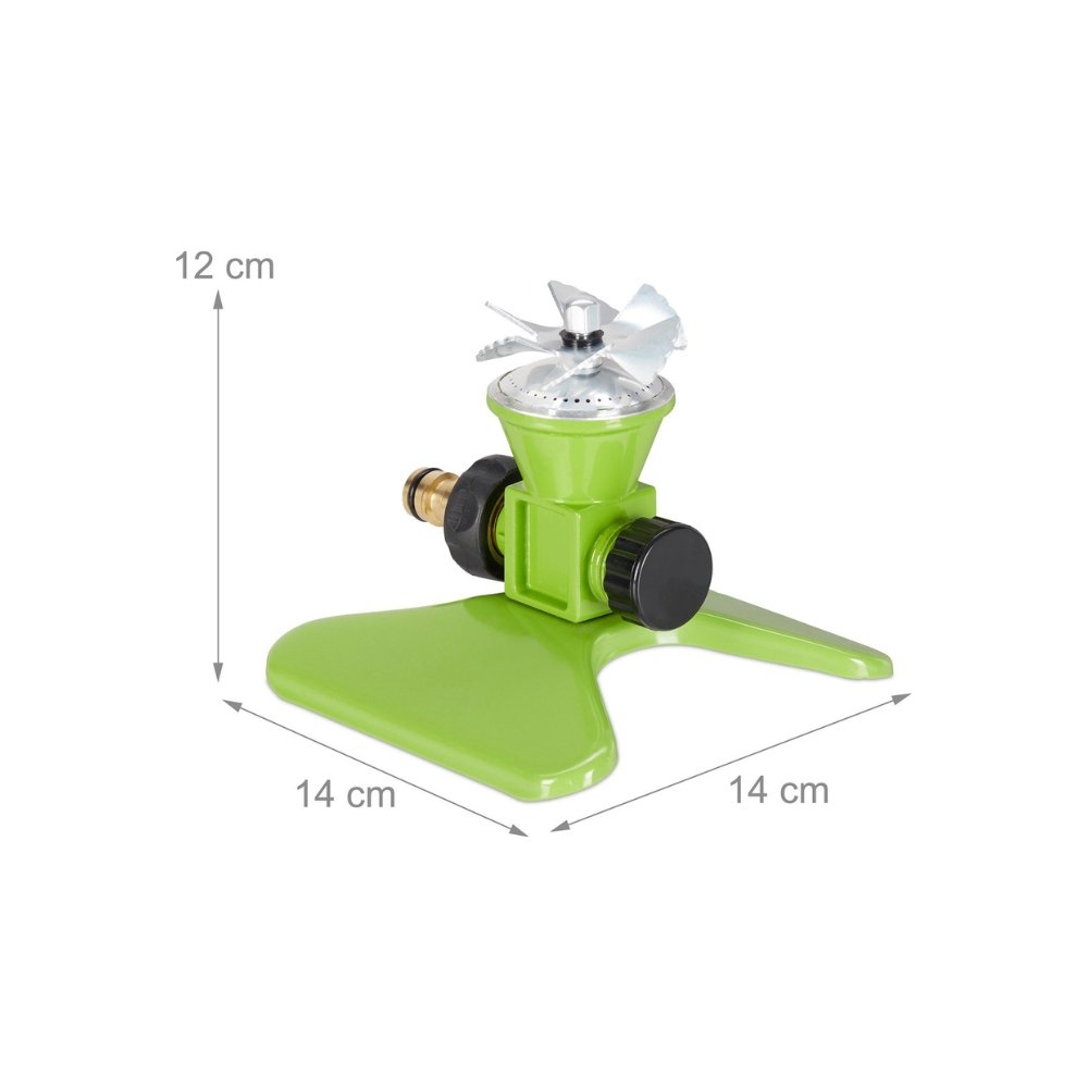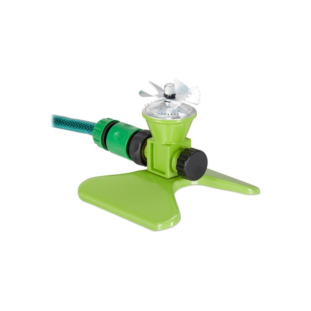 The Relaxdays Garden Sprinkler Green is a compact circular sprinkler with a stable iron base, 5–6 m reach and 3/4″ connection. Ideal for round lawns and summer fun.