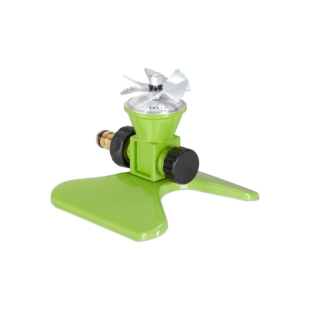 The Relaxdays Garden Sprinkler Green is a compact circular sprinkler with a stable iron base, 5–6 m reach and 3/4″ connection. Ideal for round lawns and summer fun.