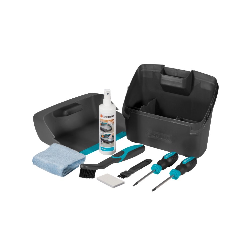 De Gardena Onderhouds- en Reinigingsset voor robotmaaiers bevat alle benodigdheden om uw robotmaaier schoon en in optimale conditie te houden. De set bestaat uit een reinigingspad, twee borstels, een reinigingsspray en een speciale schroevendraaier voor het vervangen van messen.