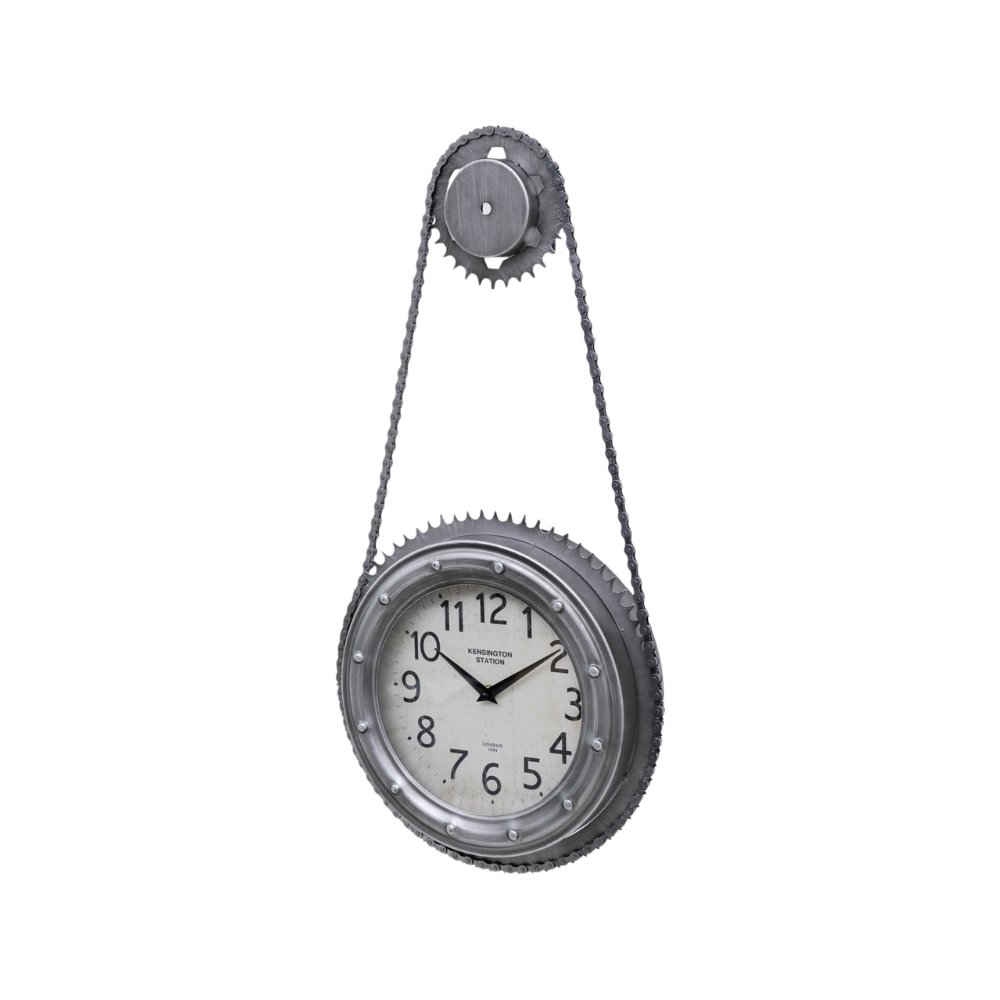 De klok wordt geleverd met een charmante metalen ketting die het industriƫle karakter versterkt en zorgt voor een authentieke look. De ketting is daadwerkelijk gesmeerd voor een realistische uitstraling. Het is daarom aan te raden voorzichtig om te gaan met de ketting om overdracht van smeermiddel op kleding of andere oppervlakken te voorkomen.